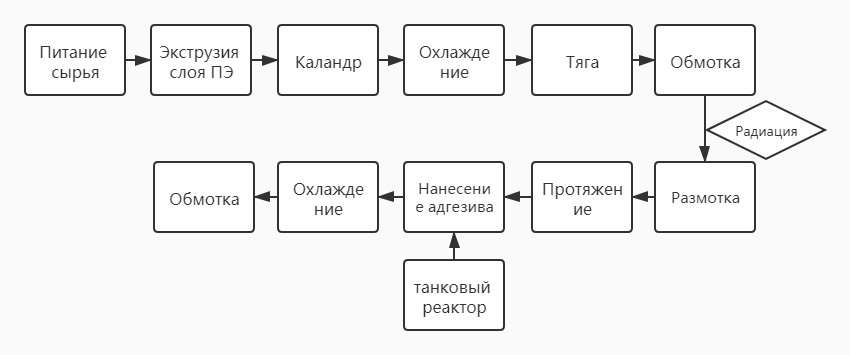 Линия по производству термоусаживающейся ленты включает в себя линию экутрузии полиэтиленовой ленты и линию для нанесения термоплавкого адгезива.